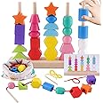 Toddler Montessori Toys Wooden Beads Sequencing Toy Set, Stacking Blocks & Lacing Beads & Matching Shapes, Shape Sorter Toys for 3 4 5 Year Old Boys Girls, STEM Preschool Learning Toys Gifts for Kids