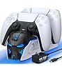 - 【Effortless Charging】Simply place two PS5 controllers onto the charger dock and the PS5 remotes start to be charged. A bright LED indicator will let you know the charging status immediately. It will be indicated with red & blue lights to show you if they are charging or fully charged. The unique LED strap on the screen will blink while in charging status. Also, the blue accent lighting on both sides combine to make a nice look with the PS5 controllers.