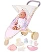 - 【28pcs All-in-One Stroller Playset 】We put everything in one box: a baby doll stroller set with high chair, a soft baby doll, 2 outfits (bunny & pajamas) and 17 accessories—diaper bag, bib, diaper, napkin and more. You open it; your little one starts playing right away.