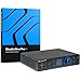 white background, 2 floating audio interfaces, blue text, dynamic black and blue rectangular product