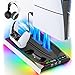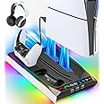 • PS5/Slim/Pro Stand for Disc & Digital Console, PS5 Cooling & Charging Station with RGB Ambient Lighting, PS5 Controller Charger Built-in 3 Level Fan, PS5/Slim/Pro Accessories Comes 3 USB Ports
