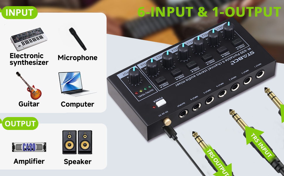 This item: STABCL Mini 6-Channel Audio Mixer with 7 pcs 6.35mm to 3.5mm Adapter Jack, Stereo Line Mixer for Sub-Mixing, Multi-Input (Mic/Guitar/Keyboard/Bass), Powered by 5V DC