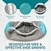 Text reads 'DESIGNED FOR SAFE & EFFECTIVE SHOE WASHING' and 'FITS MOST EVERYDAY SHOES'. Shows circular mesh or net-like material for shoe cleaning.