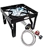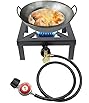 - [ Premium Quality Material ] - Portable propane burners for outdoor cooking, made of cast iron for durability. Our outdoor propane burner comes with a top heat shield that prevents oil spills and prevents flames from burning into the hose connections, and a bottom heat shield designed to protect parts and surfaces from heat damage and enhance thermal protection