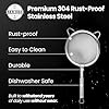 - FOOD GRADE & BUILT TO LAST - Made of premium quality stainless steel and solid construction with latest laser welding technology. Our mesh strainers for kitchen feature broad rimmed framework design with two ears and super sturdy handle. Easy to storage and hang fine mesh sieve.