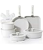 16-piece set includes: One egg wonder, 8" Fry Pan with pour spouts,10.5" Fry Pan with pour spouts10.25" Square Griddle, 1-qt. Saucepan with lid and measuring marks, 3-qt. Saucepan with lid and measuring marks, 5qt Dutch Oven with lid and measuring marks,13" Cookie Sheet, Pasta spatula, skimmer, spoon, slotted spatula, full spatula