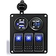 12V/24V Rocker Switch Pane Waterproof Blue LED Power Control Device with 3 Gang Toggle Switches Female Power Socket Dual USB 3.1A Power Output Port for Marine Boat Truck Rv Vehicles