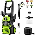 - Multi-Functional All-In-One: The electric high-pressure washer comes with four quick-connect nozzles (0°, 15°, 25°, 40°) for precise cleaning and quick replacement — switch between high-pressure concrete cleaning and gentle glass cleaning modes in seconds. The 500ml foam gun produces abundant foam to easily remove dirt from vehicle bodies.