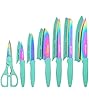 - 12-piece color-coded knife set includes 6 knives with matching knife covers Knives include: paring knife, utility knife, Santoku knife, carving knife, chef knife, and bread knife