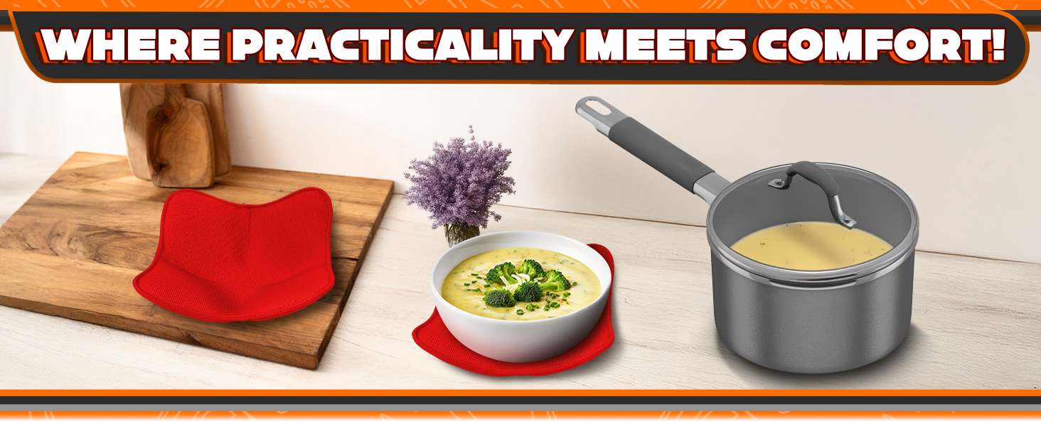 • Design of Hot Bowl Holder: Grab the soup bowl cozy from the edges and pull them out without burning your hands. These red pot holders microwave cool caddy with handles perfectly wrap your bowl to cover it from all sides, allowing you to take the hot bowl out of the microwave conveniently.