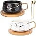 Peohud 2 Pack Ceramic Tea Coffee Cup, 10 OZ Coffee Mug with 304 Stainless Steel Spoon and Bamboo Saucer, Marble Espresso Cups for Latte, Cappuccino, Americano, White and Black