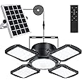 - 【Split Design with 4 Adjustable Light Arms】Solar panel and lamp body of solar pendant lights outdoor indoor with remote are designed separately, 16.5 feet long wire is sufficient for indoor and outdoor use. The four light arms of solar powered shop light for shed can adjust to 120°, allowing you to rotate the angle according to the application. You can also adjust the angle of the solar panel for optimum sun exposure and to increase the conversion of solar energy.