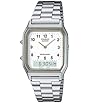Reboot your retro vintage style with a contemporary update on the 1980s AQ-450 design. This brand-new vintage style watch is a beautiful blend of retro and stylish. A separate dial and LCD serve up analog beauty alongside digital performance. The LCD angles gently to follow the lines of the lugs, while the analog dial features simple bar index marks. The watch face adorned in a grid pattern adds the final touch for a real retro feel. The combination of the angular case and the straight links of the metal band is a simple and stylish celebration of structural beauty. More than just a fashion statement, these timepieces deliver practical functions like dual time, stopwatch, and alarm, as well as water resistance for daily use to free you from worry, even on rainy days.