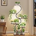 CODACE Indoor Plant Stand with Grow Lights - 7 Tiered Metal & Wood Plant Shelf, S-Shape, Black