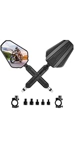 • 【Easy to Install】Multiple adapters included allow you to install at different heights. Package included:2 x Side View Mirrors; 2 x Clamps for 7/8" handlebar ;5 x Threaded Mounting Bolts (8MM and 10MM)