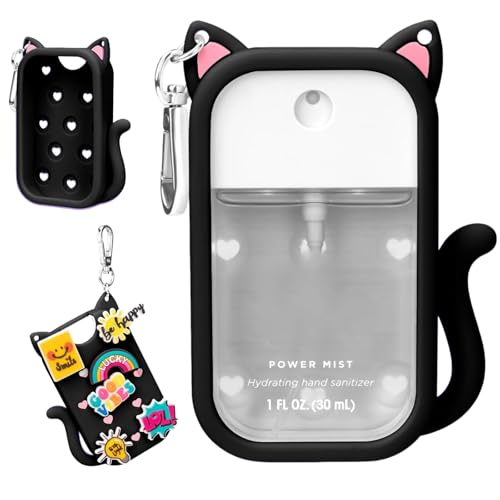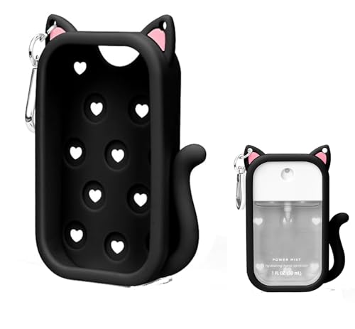 Cat Silicone Case for Touchland Hand Sanitizer Spray, Compatible with Power Mist Glow Mist 1 FL Oz/30ML for Touchland Case, with 6 Charms and Keychain Accessory Cute Travel Cover Sleeve (Black)