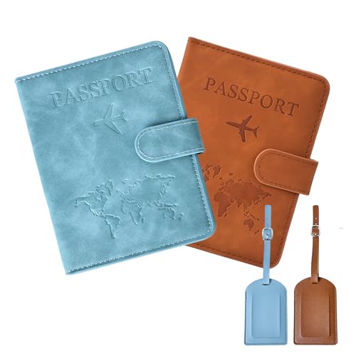 Swpeet 4Pcs Brown and Baby Blue PU Leather Passport Cover Holder and Luggage Tag Set, 2 Passport Covers 2 Luggage Tags, Passport Holder Travel Suitcase Tag, Passport Covers and Organizer for Travel