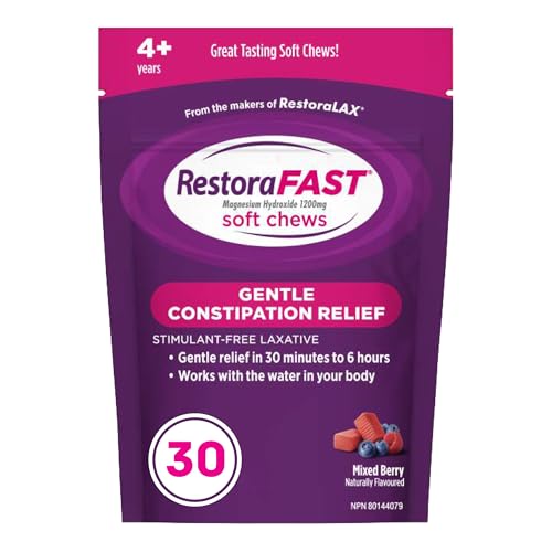 RestoraFAST Soft Chews, Fast Acting Laxative, Stimulant Free, Gentle Constipation Relief for Adults and Kids Age 4+, Mixed Berry Flavour, 30 Count