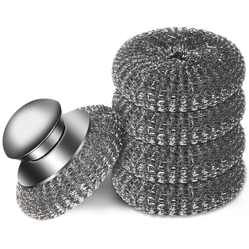 SUBEKYU Cast Iron Scrubber with Silicone Handle, Stainless Steel Cast Iron Skillet Cleaner Chainmail Scrubber for Pans, Grey