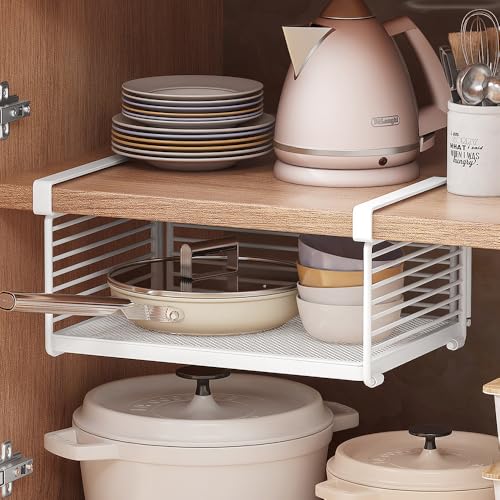 Extendable Under Shelf Organizer, Hanging Under Cabinet Shelf, Space Saving Shelves Storage Basket for Laundry, Kitchen Cabinet, Pantry, Closet, Desk (White)