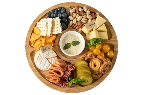 YANG Charcuterie Board with Lid, Divided Bamboo Serving Tray with Handle & Locking Lid, Portable Serving Platter for Party Outdoor Picnics Camping Gift Ready (5 Compartments,Round)