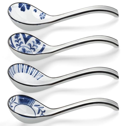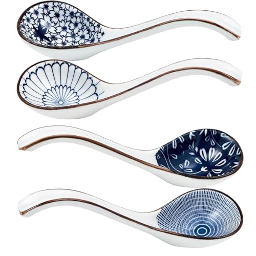 JANKOW 4 Pack Japanese Ceramic Soup Spoons, Long Handle Japanese Round Soup Spoon, Hand-Painted Porcelain Soup Spoons for Ramen Wonton Noodles Miso Dumplings