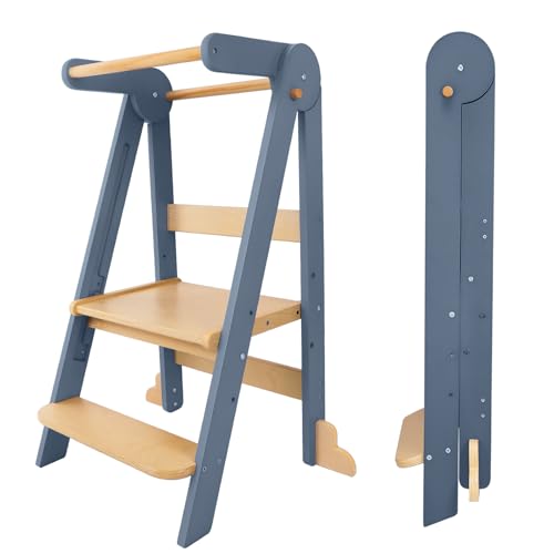 HARPPA Nordi Foldable Toddler Kitchen Tower, Adjustable Montessori Learning Helper for Kitchen, 3 Height Settings, Space-Saving Standing Tower for 18鈥48 Months, Grey