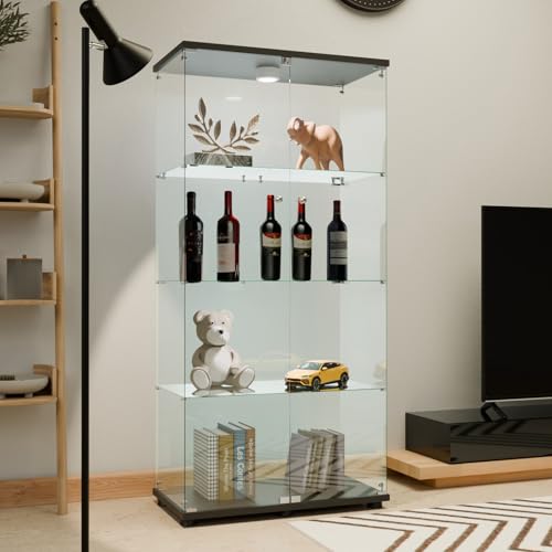 BROTTAR Corner Display Cabinet with Glass Doors, 65" Lighted Curio Cabinet with 3 Color Lights for Collectibles, 4-Tier Display Case Bookcase with Human Body Sensor for Toys, Books, Trophy, Black