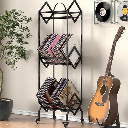 Maeklon 3-Tier Vinyl Record Storage Rack with Wheels, Holds Up to 200 LP Albums锛孧obile Record Display Holder for Albums, Large Capacity Record Holder for Books, Magazines and Office Files