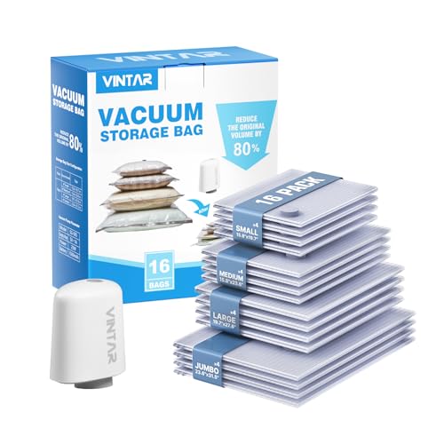 Vacuum Bags for Travel with Rechargeable Cordless Pump, VINTAR 16 Combo (4J+4L+4M+4S) Sealer Bags for Clothes Storage Travel, Space Saver Compression Packing for Suitcase and Luggage