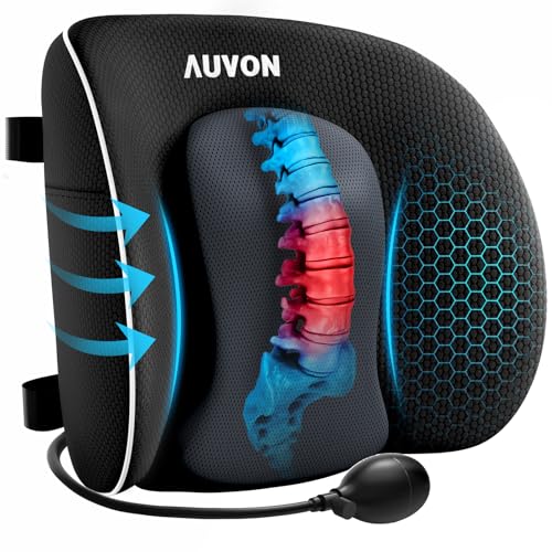 AUVON Inflatable Lumbar Support Pillow with Adjustable Firmness for Office Chair, Ergonomic Memory Foam Back Cushion for Lower Back Pain Relief, Lumbar Pillow with Cool Fabric for Long-Sitting Comfort