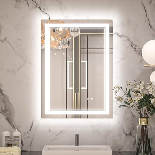 Keonjinn 28 x 20 Inch Bathroom Mirror with Light, Frontlit & Backlit LED Bathroom Mirror with 3 Color Lights, Stepless Dimmable Mirror with Anti-Fog, Safe Tempered Glass(Horizontal or Vertical)