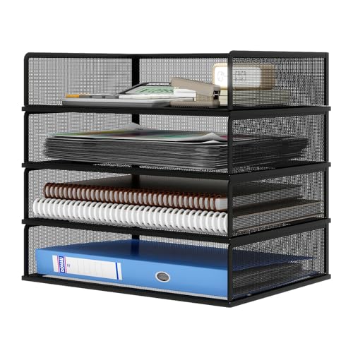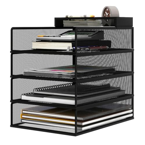 Samstar Mesh Desk File Organizer Letter Tray Holder, Desktop File Folder Holder with 3 Paper Trays and 2 Vertical Upright Section, Black.