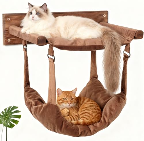 JSPYFITS Wooden Cat Furniture Wall Mounted, Double Layer Hammock, Large Size 18.9鈥 Removable Multi-Function Cat Bed for Sleep/Play/Climb, Kitten Window Perch, Easy DIY Installation(Brown)