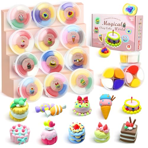 Air Dry Clay Kit - Cake Themed, Modeling Clay for Kids, DIY Model Magic Clay with Sculpting Tools and Tutorials, 12 Boxes Molding Clay, Ultra Light, Soft & Non-Sticky, Arts and Crafts Gift for Kids