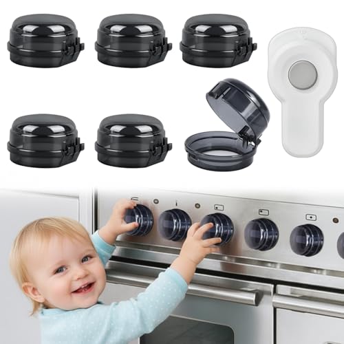 GRENFU Stove Knob Covers for Child Safety (5 + 1 Pack) Gas Stove Knob Covers with Strong Adhesive Double-Sided Tape Oven Knob Covers for Child Safety Prevent Kids & Pets from Turning on Stoves Black