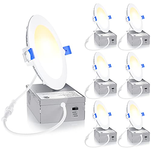 ETLCCT LIGHT 3CCT 6 Pack 4 Inch Dimmable 9W LED Recessed Slim Pot Lights with Junction Box, 750LM Recessed Ceiling Lights Downlights, 3000K 4000K 5000K Switchable