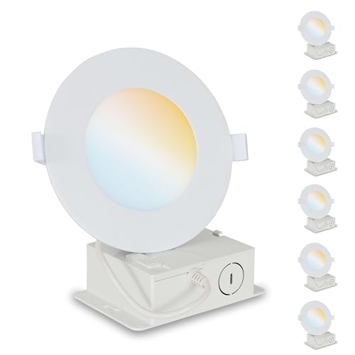 JESLED 4Inch 6CCT LED Recessed Slim Pot Lights with Junction Box, 2700K 3000K 3500K 4000K 5000K 6000K Changeable, 9W 750LM Dimmable IC Rated Ceiling Lighting, 6 Pack