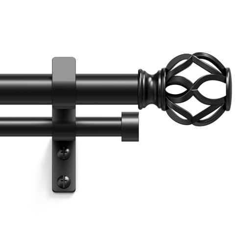 Double Curtain Rods for Windows,Decorative Adjustable Telescoping Window Drapery Rod 72-144 Inches, Classic Stylish Lantern Iron Finials, Solid Alufer Brackets,Heavy Duty Window Rods, Matte Black