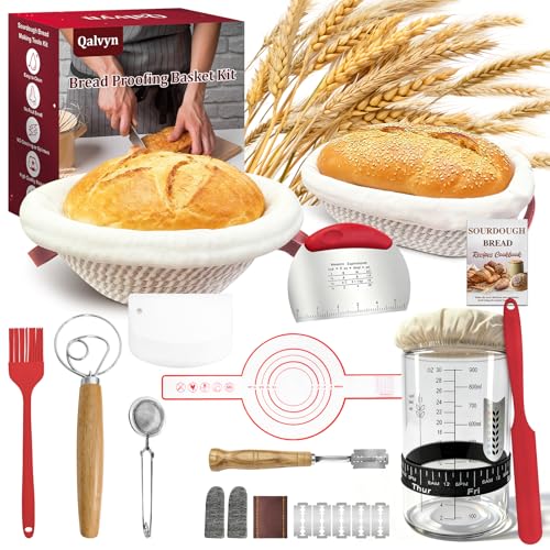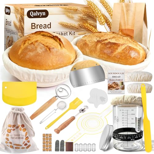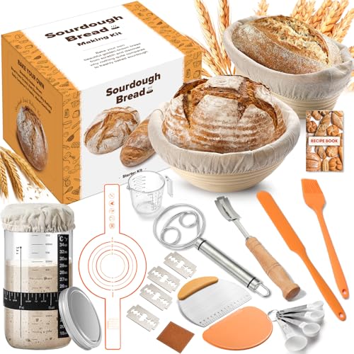 Complete Sourdough Bread Starter Kit with 2 Banneton Proofing Baskets, 34oz Starter Jar, Dough Whisk, Scrapers, Bread Lame, Mat, Sling, Flour Duster & More 鈥 Sourdough Tools & Accessories Set