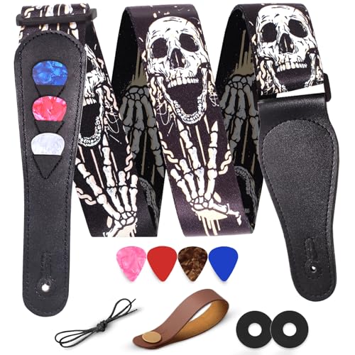 1 1/2 inch Wide Kids Guitar Strap Printed With Skull and Cross Bones Design And Black Garment Leather Ends. Black Plastic Slide and Loop Adjusts from 28.5 to 49 inches.