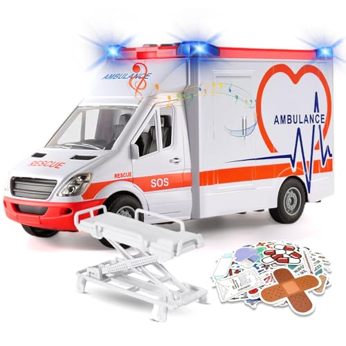BLmukce Ambulance Toy for Kids 3-9 Years Old with Light and Sound - 4 Figures, Medical Accessories & Stretcher - Friction Powered Emergency Vehicle Carrier Gift for Boys and Girls