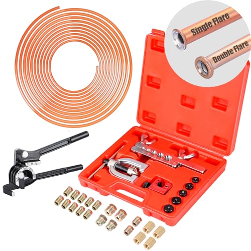 WODHMIEY 3/16" Brake Line Tubing Kit, Flaring Tool Set for Single and Double Flares with 25Ft Copper Plated Iron Tube, Flaring Cone, Tube Cutter, Flaring Bar, 5 Adapters, 16 Threaded Fitting
