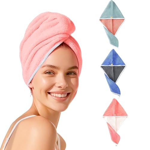 HALLEY Cotton Hair Towel Wrap 鈥 3 Packs Super Absorbent, Anti Frizz Fast Drying Hair Towel for Curly Long Thick Hair 鈥 Hair Turbans for Wet Hair with Button 鈥 Hair Plopping Towel (Pink, Blue, Black)