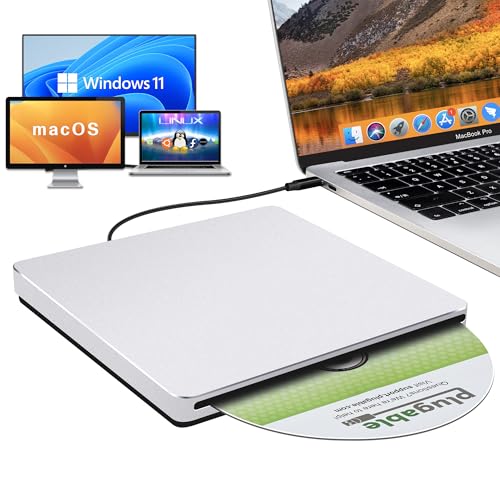 External CD DVD Drive USB3.0/Type-C USB Superdrive External Portable DVD CD Player for Laptop/Desktop, Compatible with Mac/Windows/Linux DVD CD Burner/Writer (Sliver)
