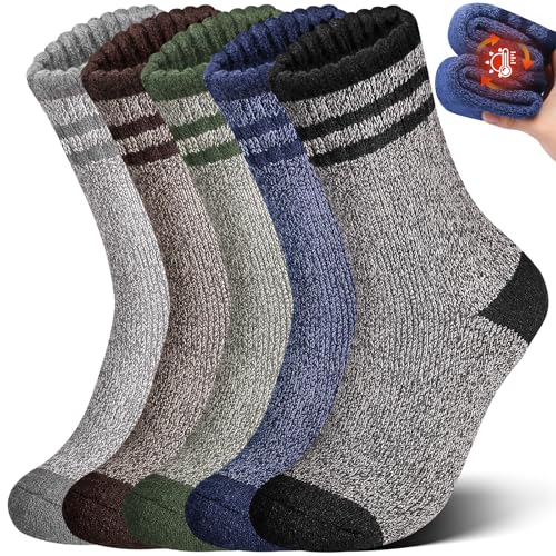 5 Pairs Merino Wool Socks Mens, Thick Warm Winter Hiking Socks, Casual Soft Breathable Crew Socks for Men
