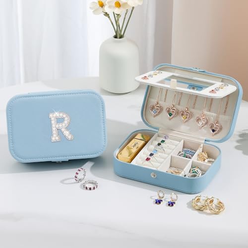 Seorsok Personalized Letter Jewelry Box, PU Leather Travel Portable Case with Mirror, Mini Pink Alphabet Flower for Women Mom Girls Gift, Jewelry Storage Case for Rings Earrings Necklace, Letter S