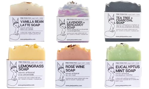 Pink Posh Fox, 6 pack Soap Gift Set, Vegan, Palm Oil Free, Ethically Sourced, Cold Pressed, Cold Process Natural Soap, Variety Pack, Most Popular Scents, Essential Oil Solid Soap Bar, Sensitive Skin Safe Soap for Face and Body, Canadian Made, Christmas Gift, Bachelorette, Baby Shower, Bridal Gift