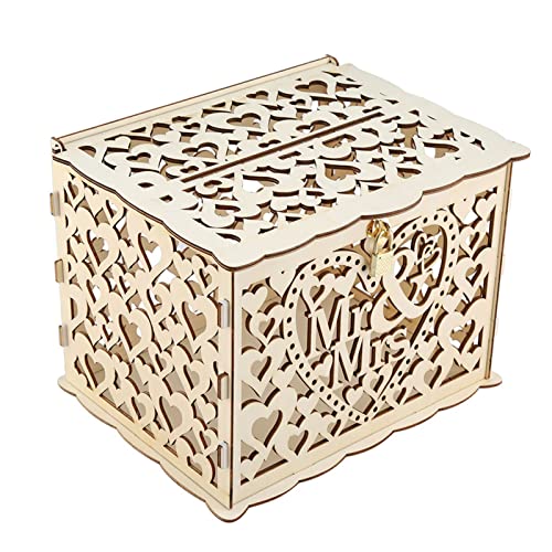 YOUEON Rustic Wood Wedding Card Box with Lock, Hearts Pattern, 11.7"L x 9.3"W x 8.7"H, Natural, Storage Box