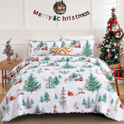 Dobuyly Christmas Quilt Set King Size, Xmas Tree Reindeer Bedspreads Reversible Green Red Plaid Coverlet Set, 3 Pieces Soft Lightweight Holiday Quilt Bedding Set 110"x90"